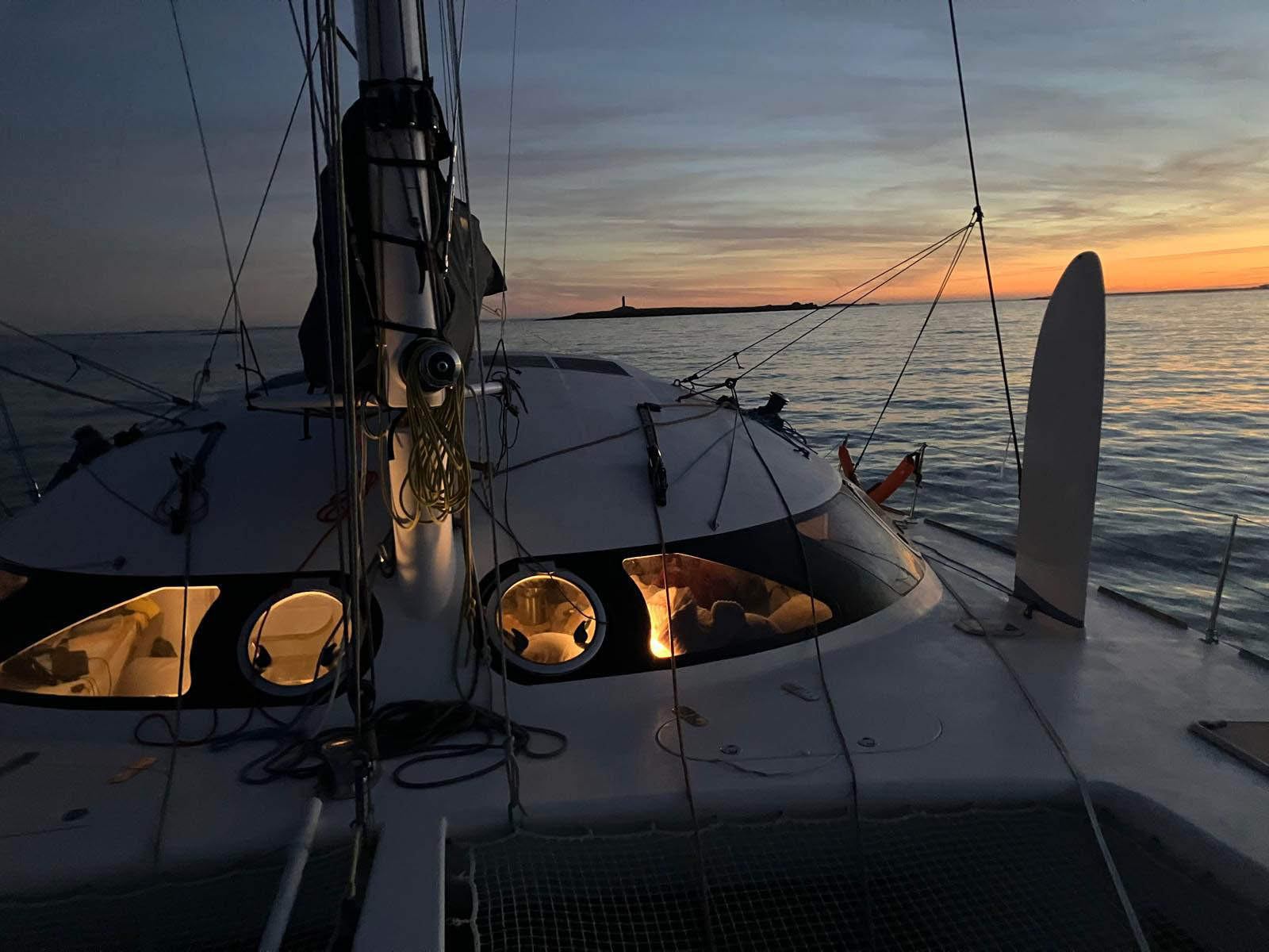 Le gréement à mât rotatif carbone est efficace mais reste facile à manier grâce aux lazy-jacks de la grand-voile et l'enrouleur de foc. Les voiles légères en tête dopent les performances par petit temps.