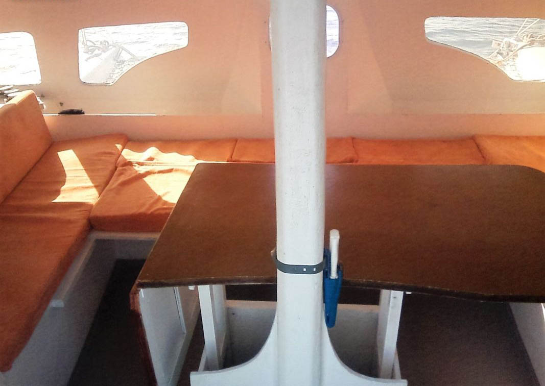 High freeboard, strong construction, snug rig and unsinkability give a really safe design. She easily takes the ground on her low-aspect keels which protect hulls and rudders. Long waterline length and semi-circular sections provide a nice average speed with comfortable motion. Her rig is simple and efficient.